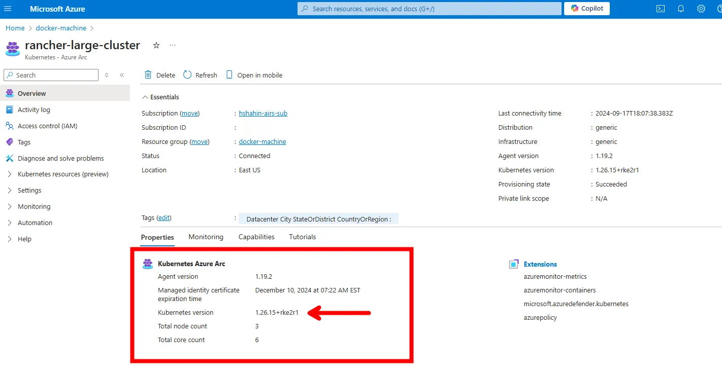 Rancher cluster appears in Azure once connected to Azure Arc. Metadata such as the Kubernetes Distribution, Version, and Core Count appear. Additional custom tags and metadata can be added for inventory management