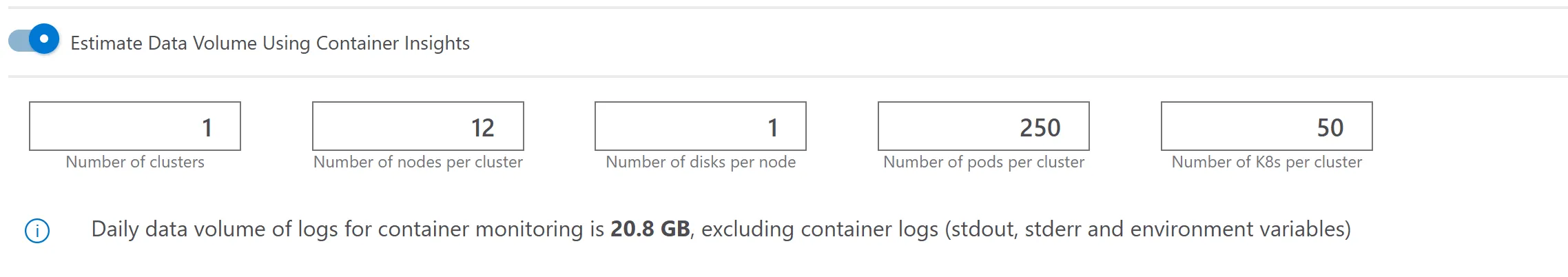 In summary, the best way to capture what your Container Insights pricing will look like is to enable the extension, have it run for a few days, and closely monitor the ingestion size. From there you can use the information to filter out unneccesary data to optimize.
