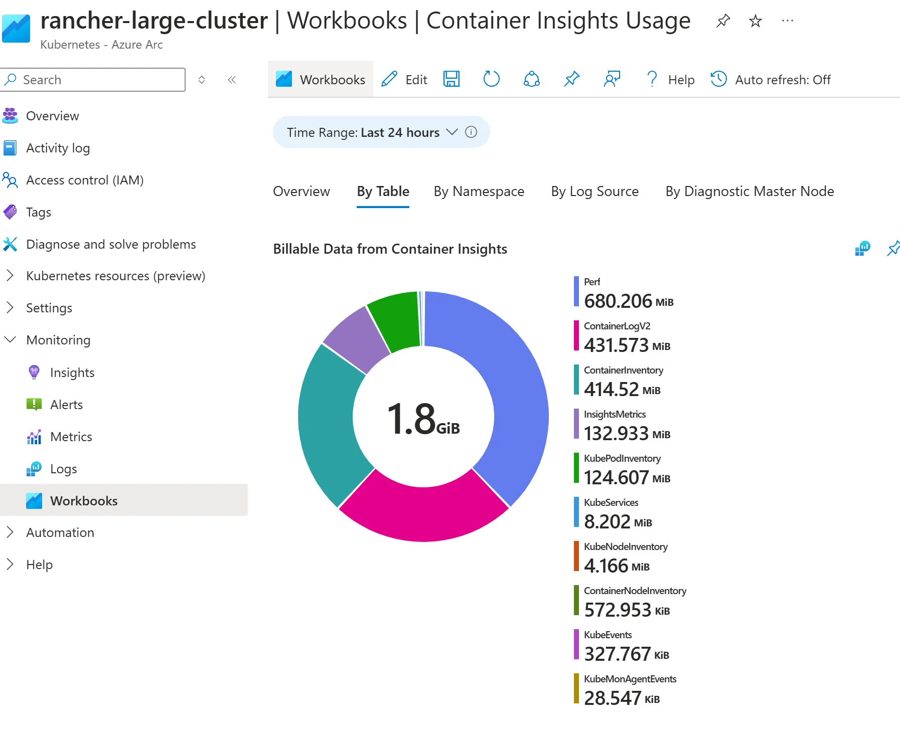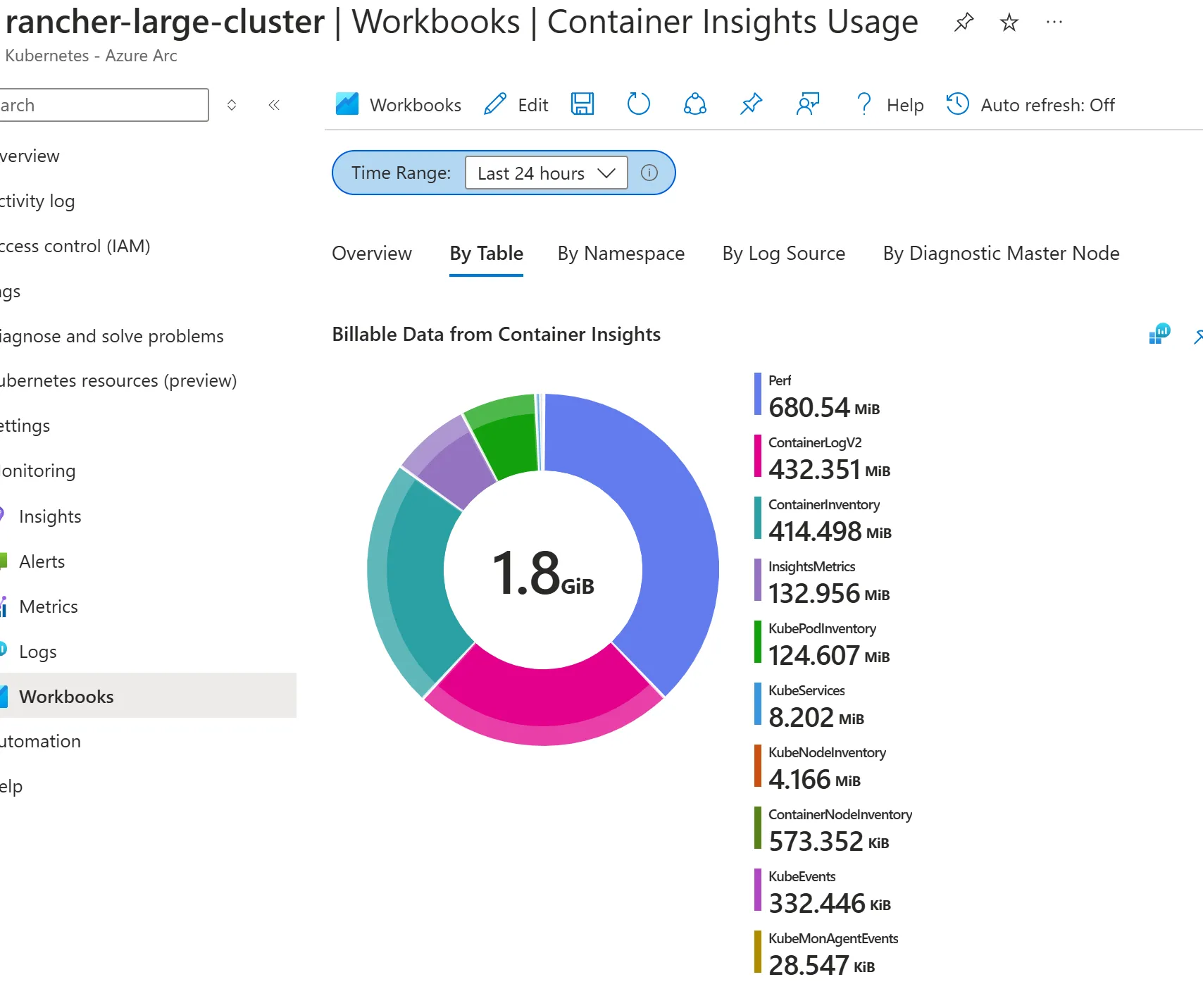Let’s also add 5 GB to that value to capture stdout logs being captured by our running pods. As shown in our 3-node rancher cluster, ContainerLogV2 was around 25% of the ingested data: