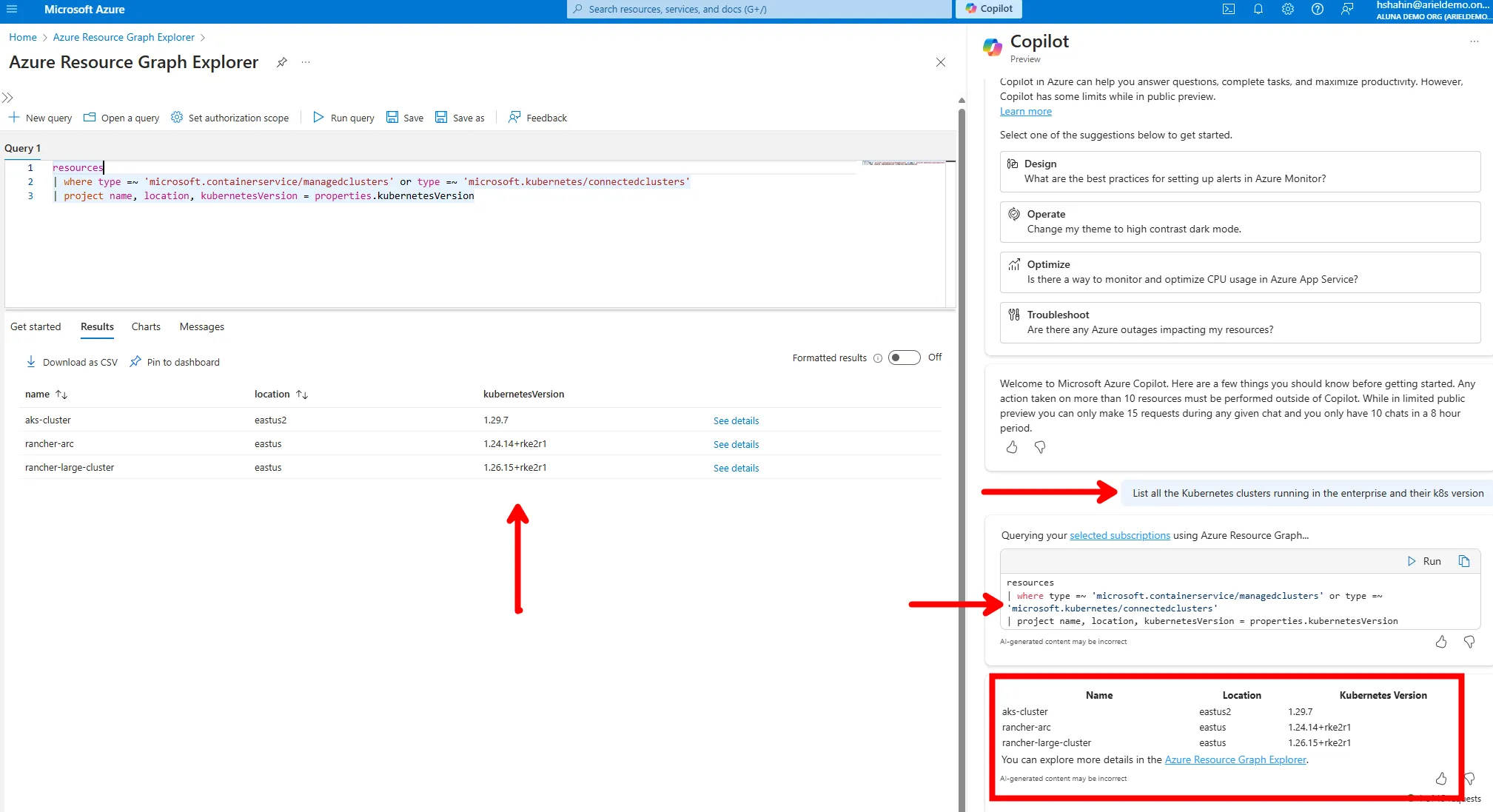 For example, in my environment I have 3 clusters deployed, 1 AKS Cluster and 2 Rancher Clusters connected to Azure through Arc. I asked Azure Copilot “List all the Kubernetes clusters running in the enterprise and their k8s version” and I got the result below: